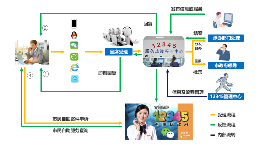 集電話、短信、微信、微博、門戶網站、手機APP多種渠道于一體的集中受理機制,市長熱線系統適應新時代市民對“互聯網+政務服務”的現實需求。整合政府資源